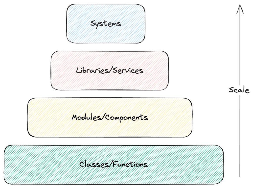 Eventually, modules and components are built up to (micro/macro)services, resulting in fully-fledged systems.