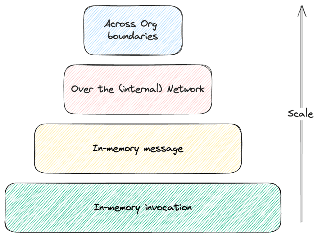 Once we move further up and we need to cross the network to communicate, messages become more explicit. Events, commands, notifications, etc., represent messages that different code components/services exchange in a (not always) beautiful choreography to implement complex behaviours. In this layer, you find REST APIs with JSON payloads, gRPC (or, if you are unlucky enough, previous interactions like CORBA, DCOM, Java RMI, .NET Remoting, etc.), Kafka/Avro, etc.